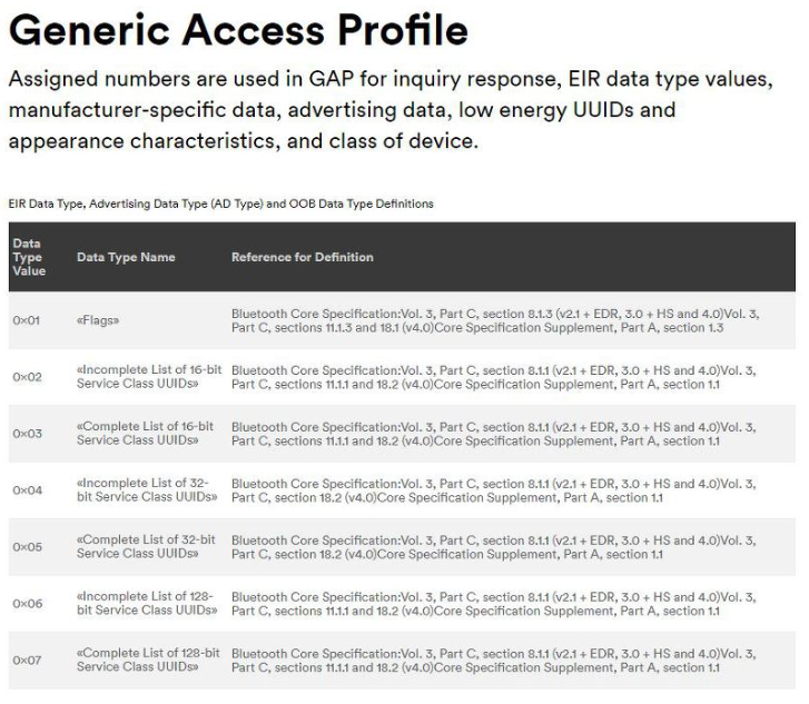 AD type는 Generic Access Profile을 나타내며 아래의 사이트를 들어가면 각각이 어떠한 역할을 하는지 알 수 있다.