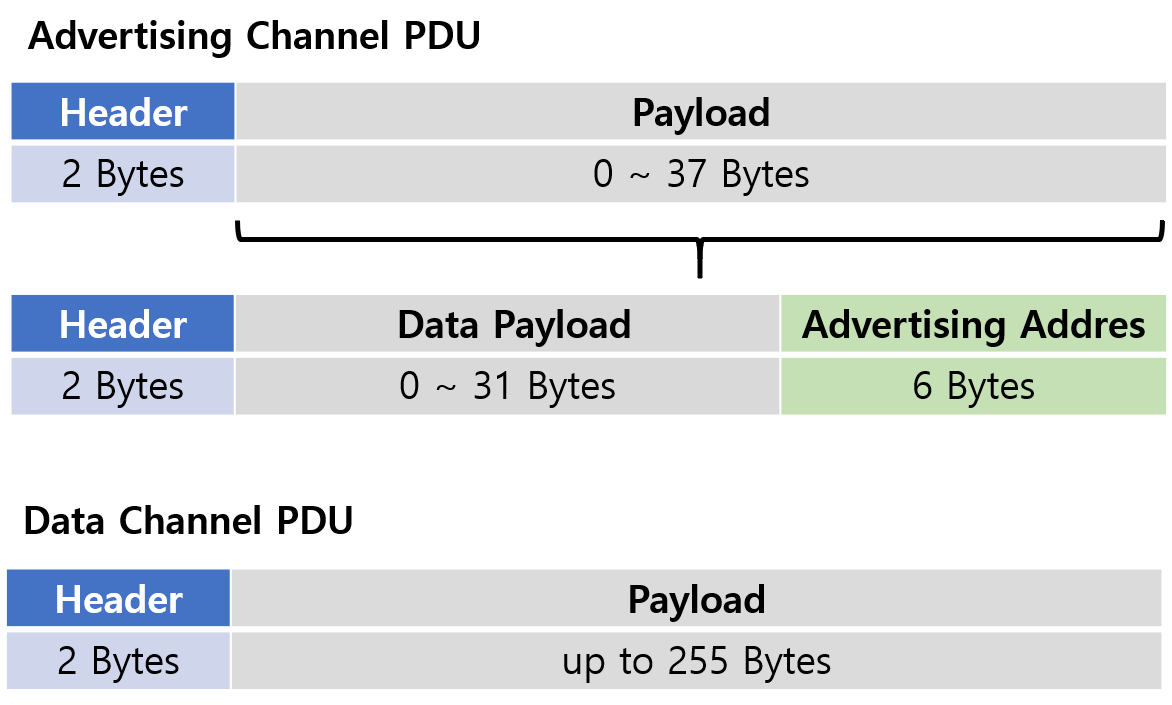 - Protocol Data Unit (PUD): Access Address가 Advertising Packet과 Data Packet으로 나뉜거와 동일하게 PDU 또한 Advertising과 Data 관점으로 패킷 구조가 나뉜다.
